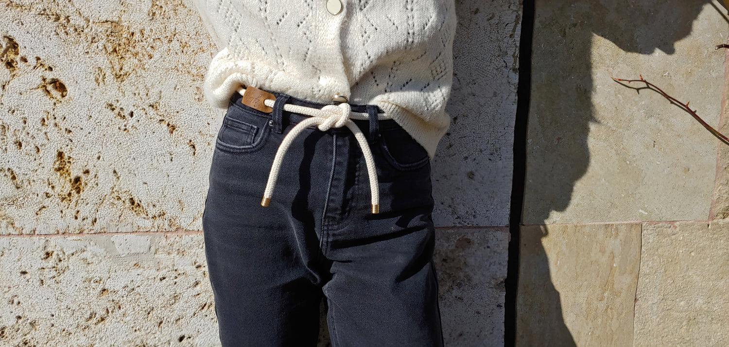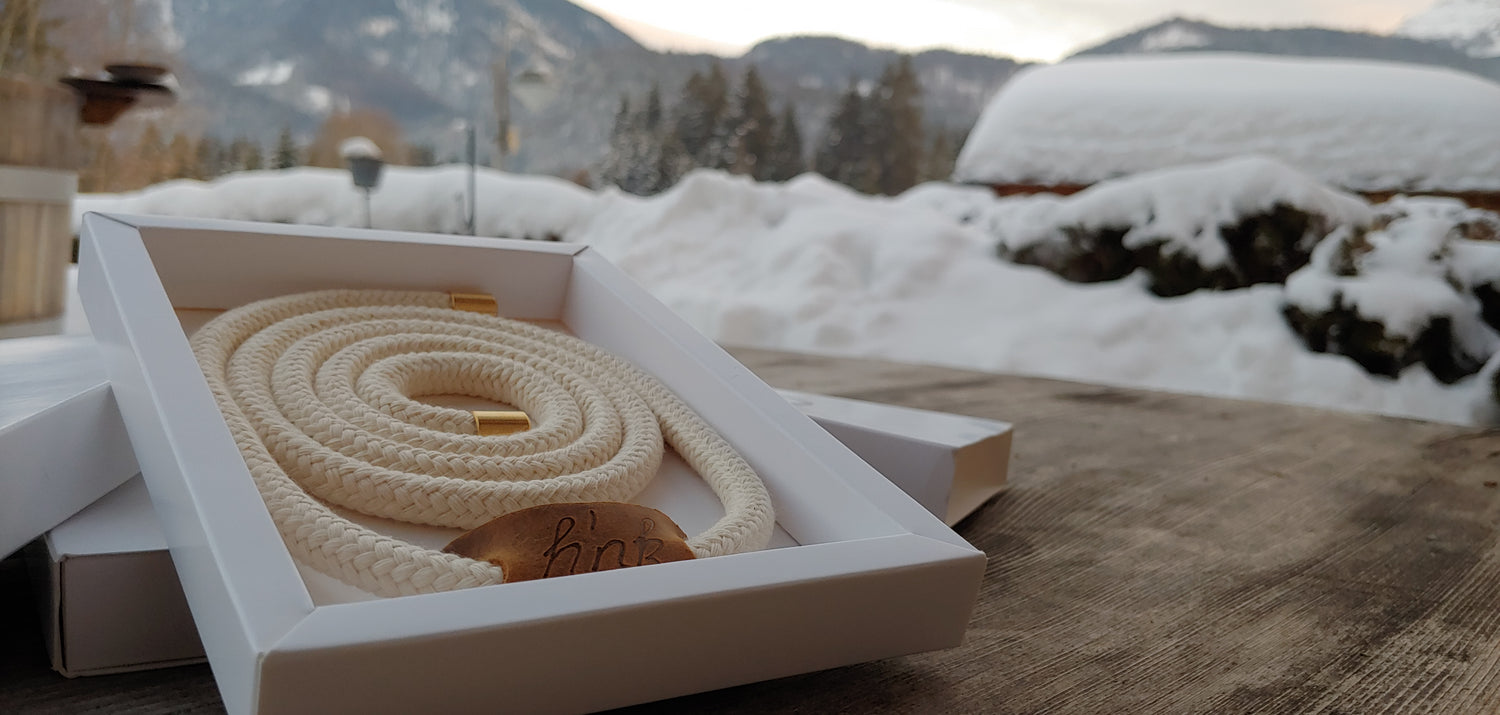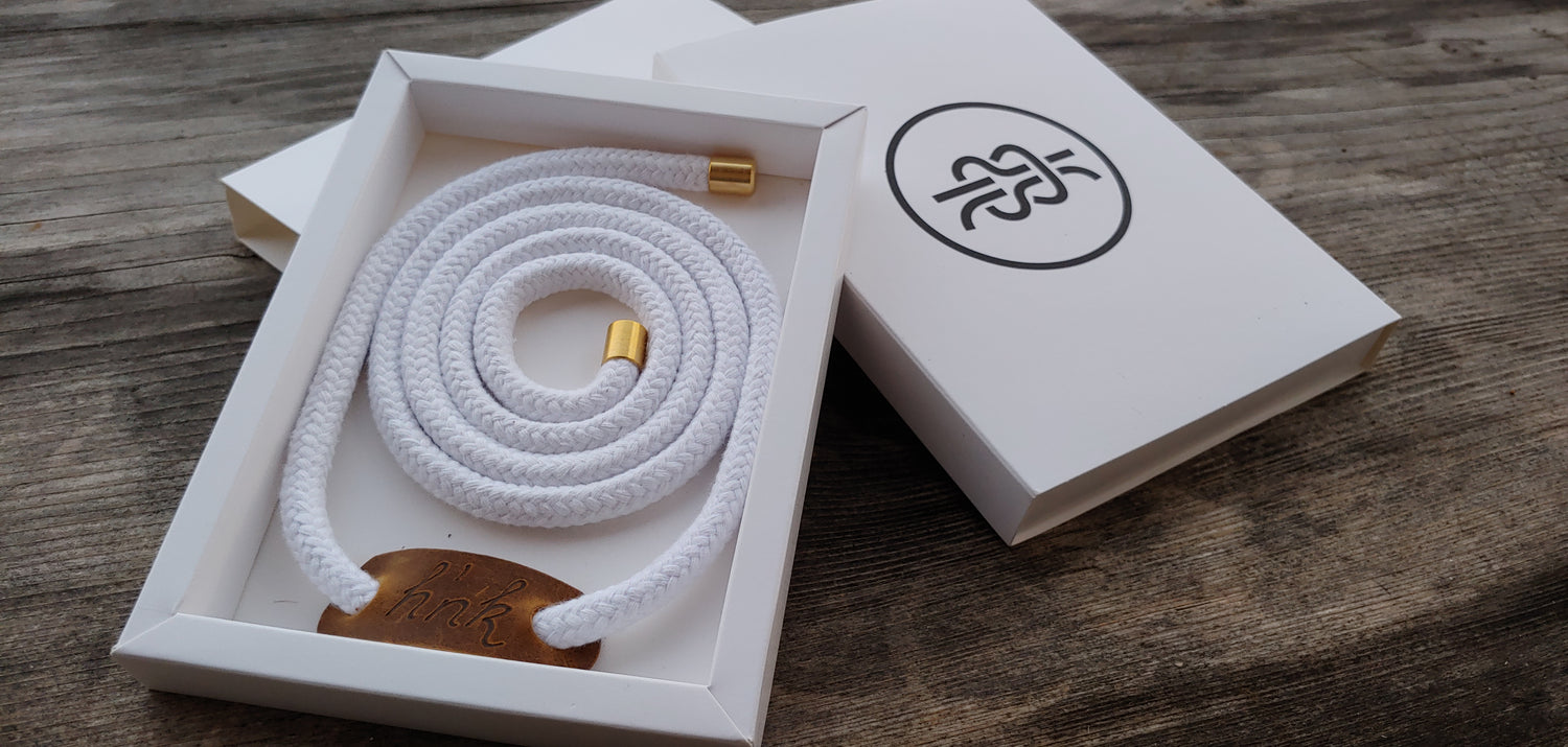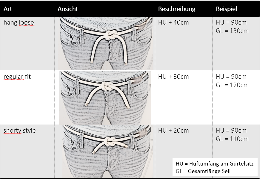 Ein Baumwollseil mit edlen Endkappen und Lederemblem mit handgebrannten Logo, geknotet mit einem Kreuzknoten – egal ob in der Jeans, zum Anzug oder zum Kleid. Nicht nur eine zweckmäßige Lösung, sondern ein Styleaccessoire mit Blickfangpotential.