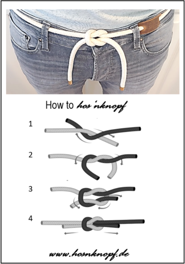Hier findet ihr eine Anleitung, wie ihr den hos'nknopf mit einem Kreuzknoten verknoten könnt.