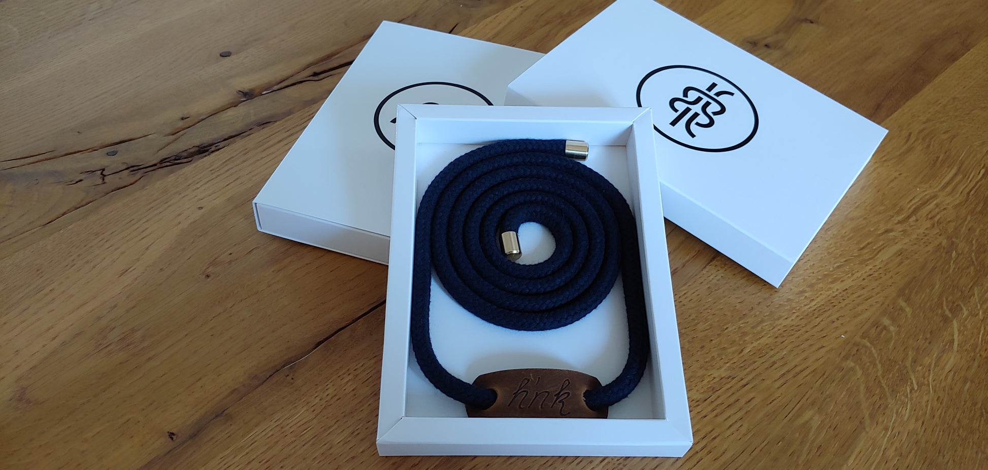 Gürtelseil dunkelblau - 8 Millimeter dick, Endkappen Messing, handgebranntes Lederemblem "h'nk".