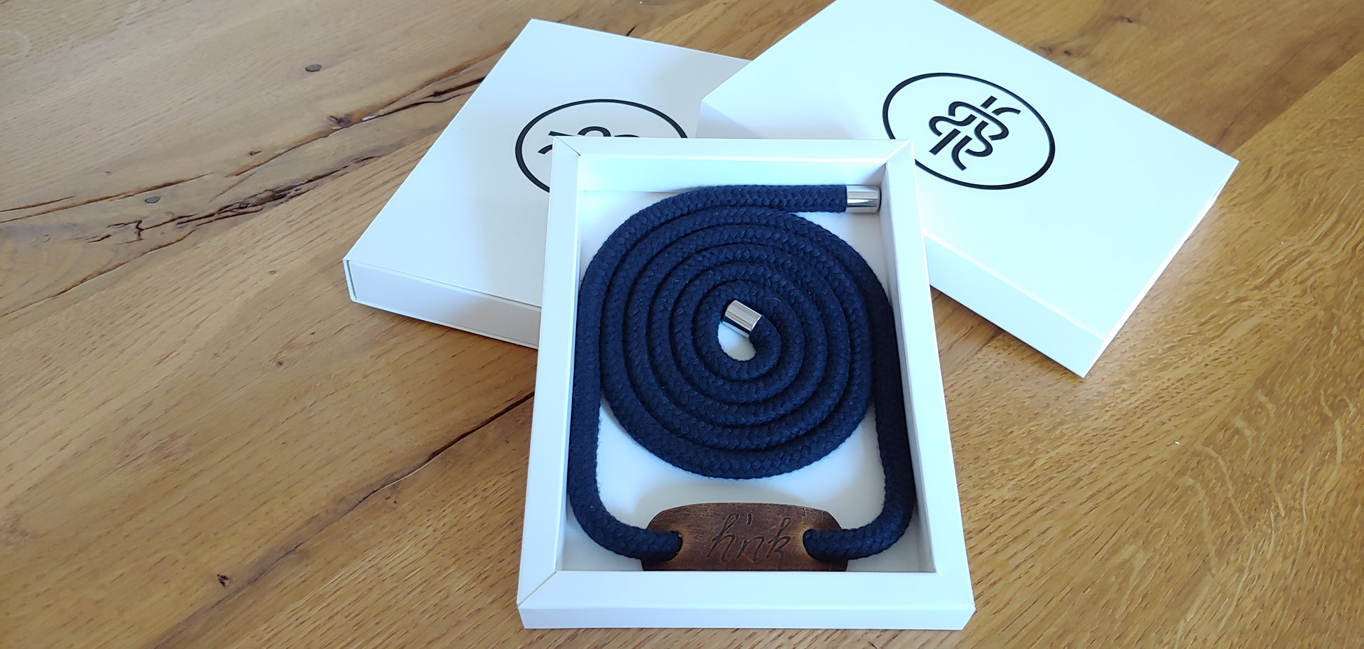 Gürtelseil dunkelblau - 8 Millimeter dick, Endkappen Edelstahl, handgebranntes Lederemblem "h'nk".