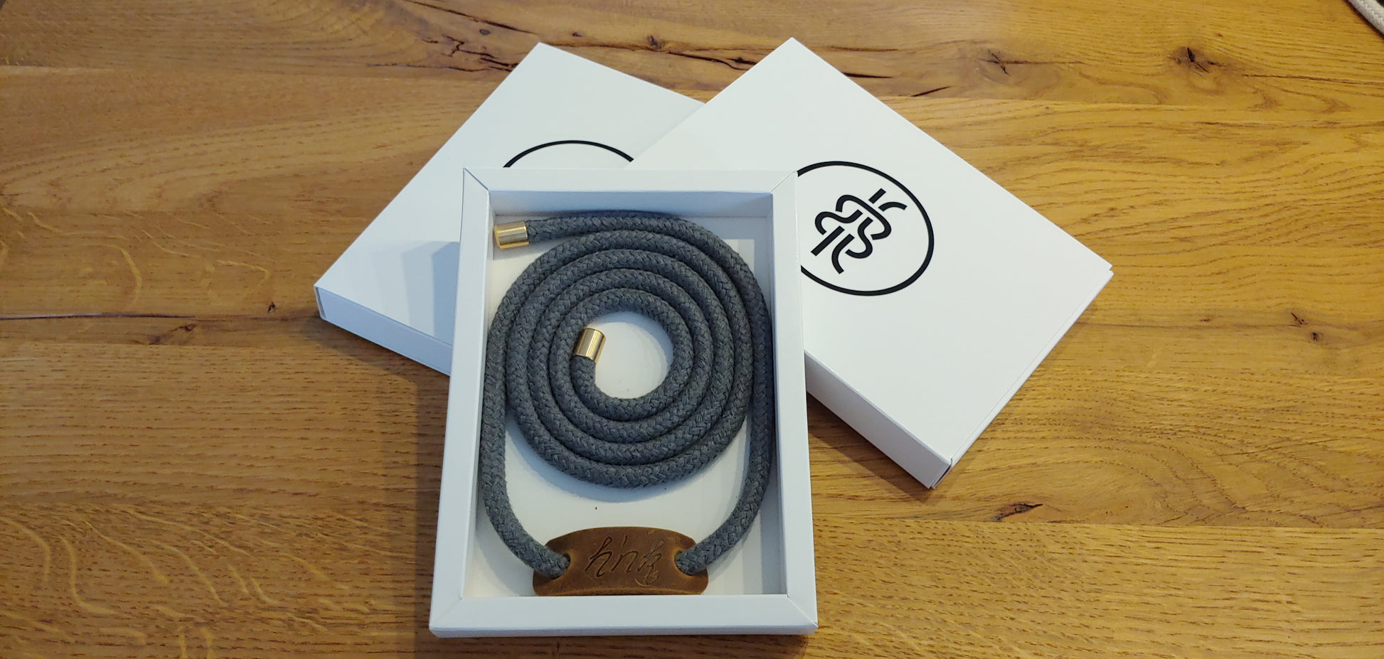 Gürtelseil grau - 8 Millimeter dick, Endkappen Messing, handgebranntes Lederemblem "h'nk".
