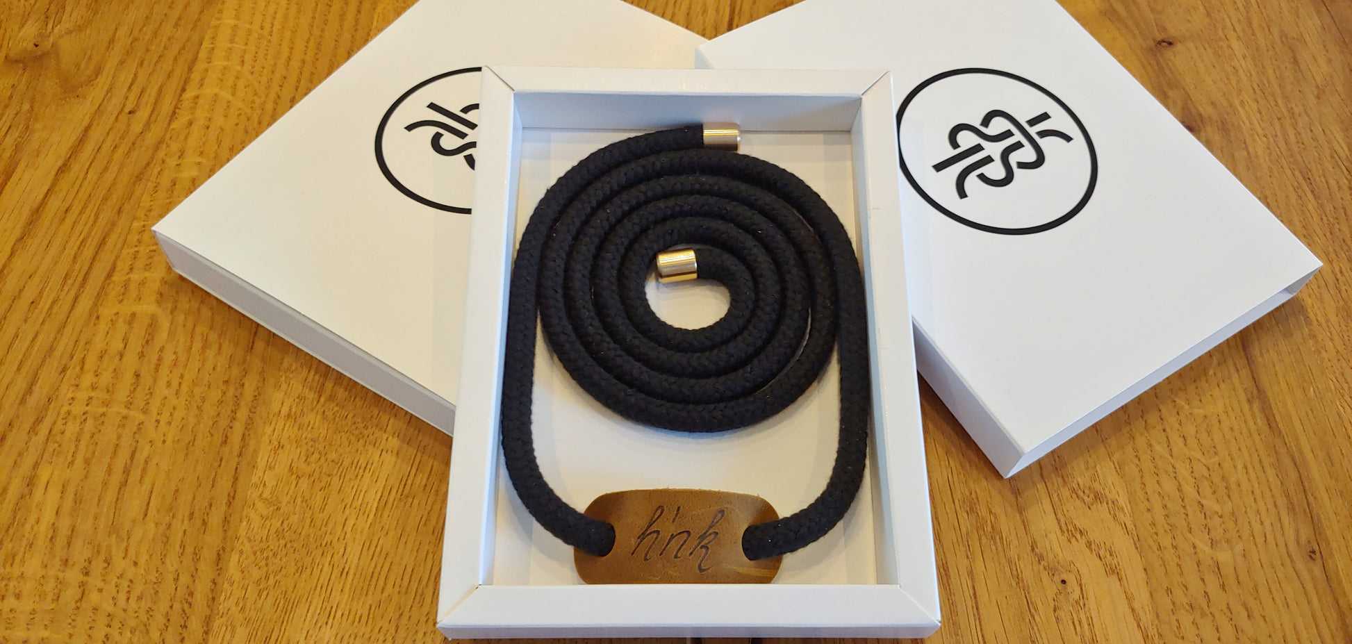Gürtelseil schwarz - 8 Millimeter dick, Endkappen Messing, handgebranntes Lederemblem "h'nk".