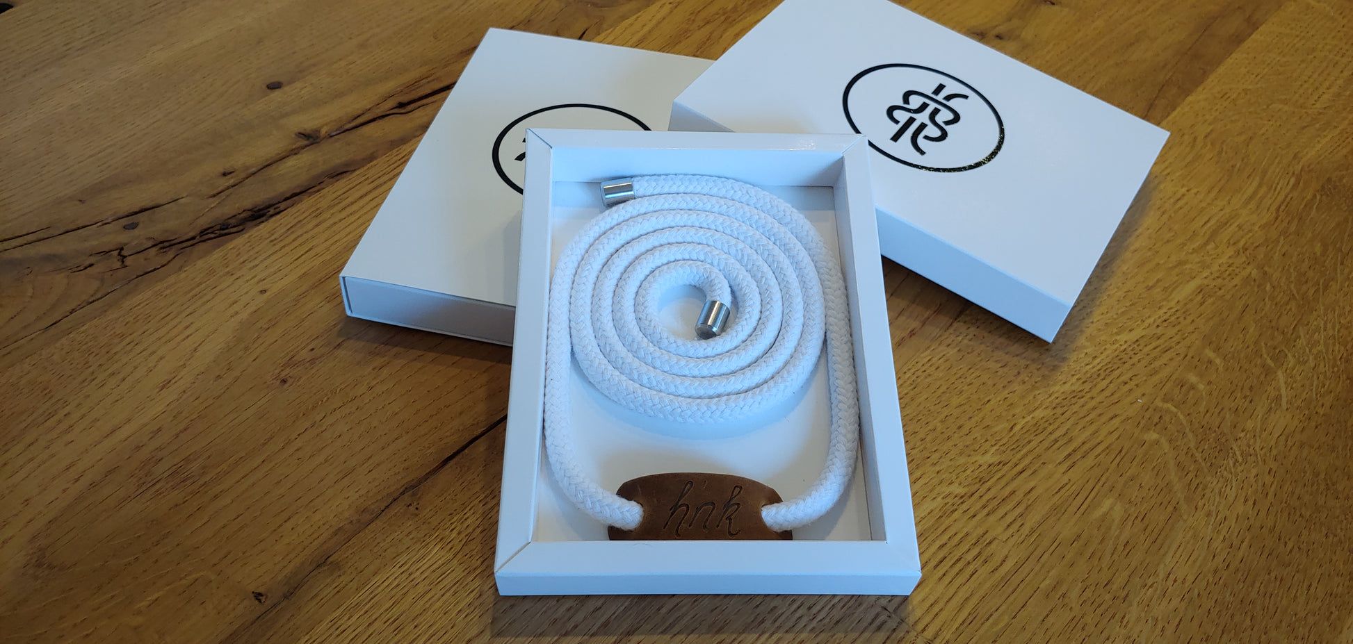 Gürtelseil weiß - 8 Millimeter dick, Endkappen Edelstahl, handgebranntes Lederemblem "h'nk".