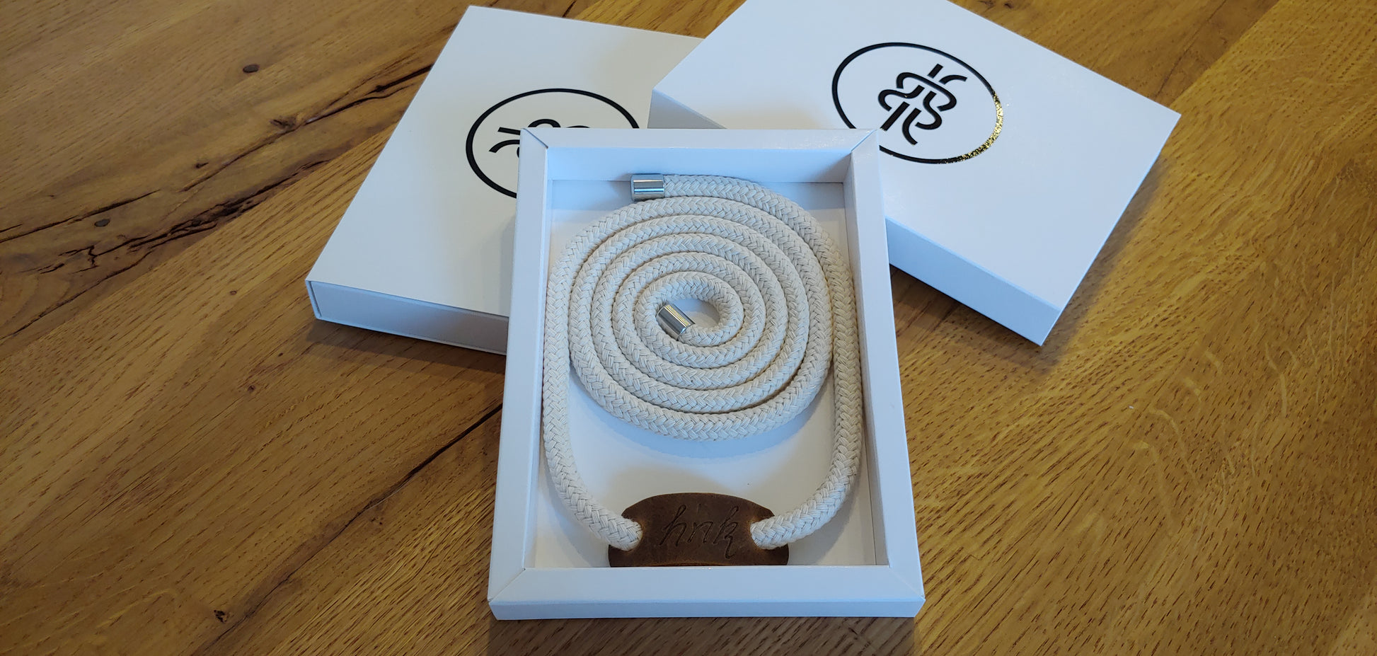 Gürtelseil beige - 8 Millimeter dick, Endkappen Edelstahl, handgebranntes Lederemblem "h'nk".